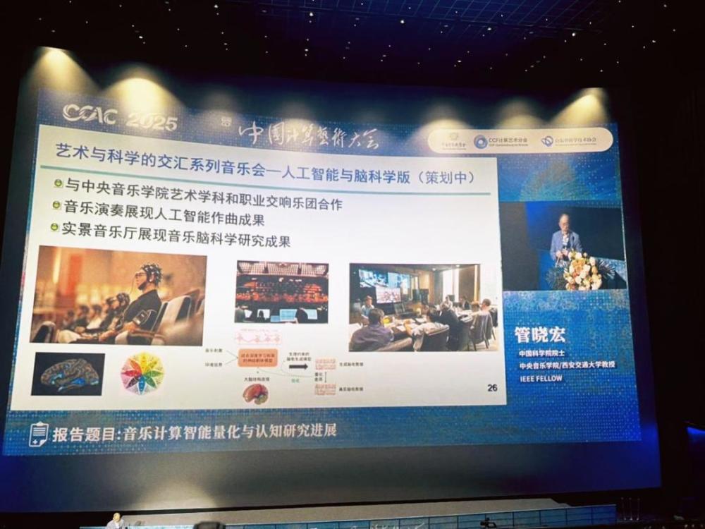 大会的主旨报告环节由大会主席、中央音乐学院音乐人工智能系主任李小兵主持,大会嘉宾、众多学术巨擘分享了前沿研究成果。中国科学院院士、西安交通大学电子与信息学部主任管晓宏做了题为“音乐计算智能量化与认知研究进展”的报告,讲述了音乐与人工智能深度融合的最新进展。北京舞蹈学院副院长肖向荣分享了题为“技术,艺术与人——AIGC时代舞蹈的突围”的报告,探讨了舞蹈艺术在人工智能时代的创新路径。北京电影学院副院长李伟的报告“数智时代的影像创作”,提出了影像创作与人工智能的深度融合对未来电影产业的巨大潜力和挑战。中央美术学院副院长吕品晶带来了题为“央美&计算艺术”的报告,介绍了中央美术学院的艺术科技成果,深入探讨了美术与计算艺术的结合。天津美术学院院长邱志杰的报告以“生成式人工智能语境下的科技艺术”为题,阐述了生成式人工智能如何在科技艺术领域开辟新天地。