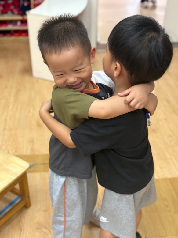 最让幼儿期待的,还是每天的“抱抱时间”。轻柔的音乐响起,教师说:“现在是抱抱时间,如果你想和谁交朋友,就去抱抱他。”总有些腼腆的幼儿不好意思,我们会先拥抱愿意的幼儿,再引导他们互相拥抱。思予因为想妈妈还在哭泣,沛沛看到后,主动去拥抱她,思予慢慢平静了下来。