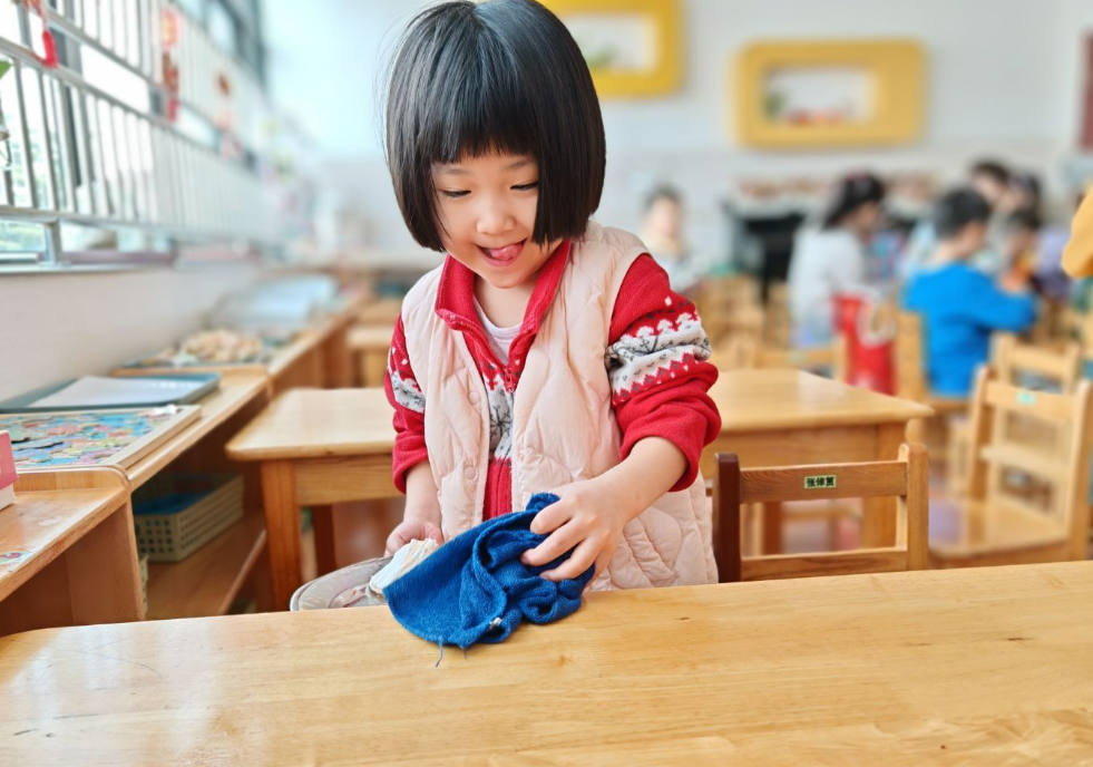 借助“步骤卡”,提升有序做事能力。针对“桌子擦不净”“椅子摆不齐”等问题,教师和幼儿一起制作步骤提示卡:擦桌子的卡片以“先擦桌面、再擦桌边、最后检查”三步图示拆解流程;整理椅子的卡片则用“推到桌下,对齐桌腿”的图标明确标准。在反复对照“步骤卡”完成值日任务的过程中,幼儿提升了观察力、执行力,逐步习得了“步骤有先后、做事有方法”的经验。