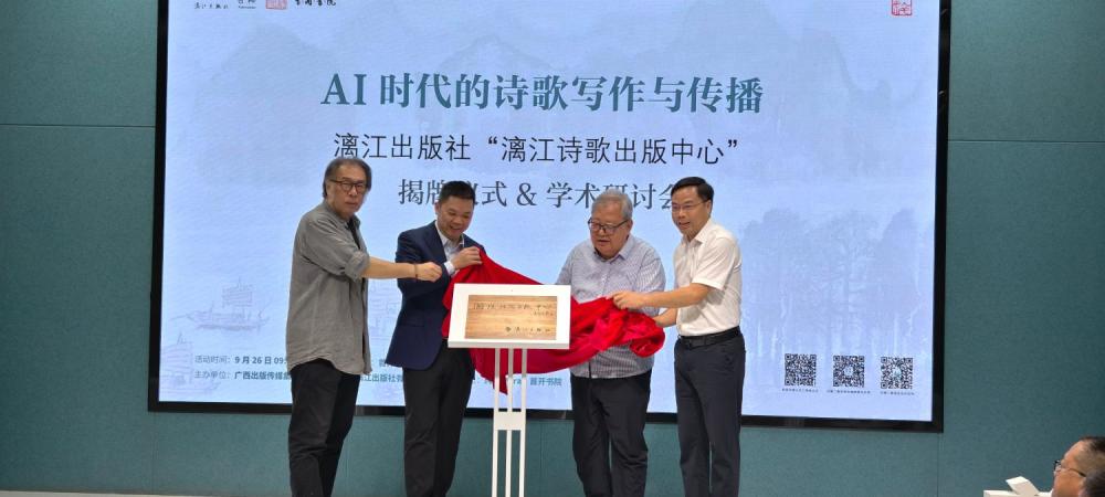9月26日,“AI时代的诗歌写作与传播:漓江出版社漓江诗歌出版中心揭牌仪式&学术研讨会”在北京首开书院举行。中国作家协会诗歌委员会主任吉狄马加、诗人西川、广西出版传媒集团总编辑卢培钊、漓江出版社社长梁志为漓江诗歌出版中心揭牌。