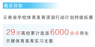 通过体育美育浸润行动计划,云南已从全省高校选派6000余名师生,定向帮扶薄弱地区中小学,积极参与受帮扶学校的体育、音乐、美术等学科教学,让乡村孩子也能享受到优质的体育美育教育,全面提升综合素质。