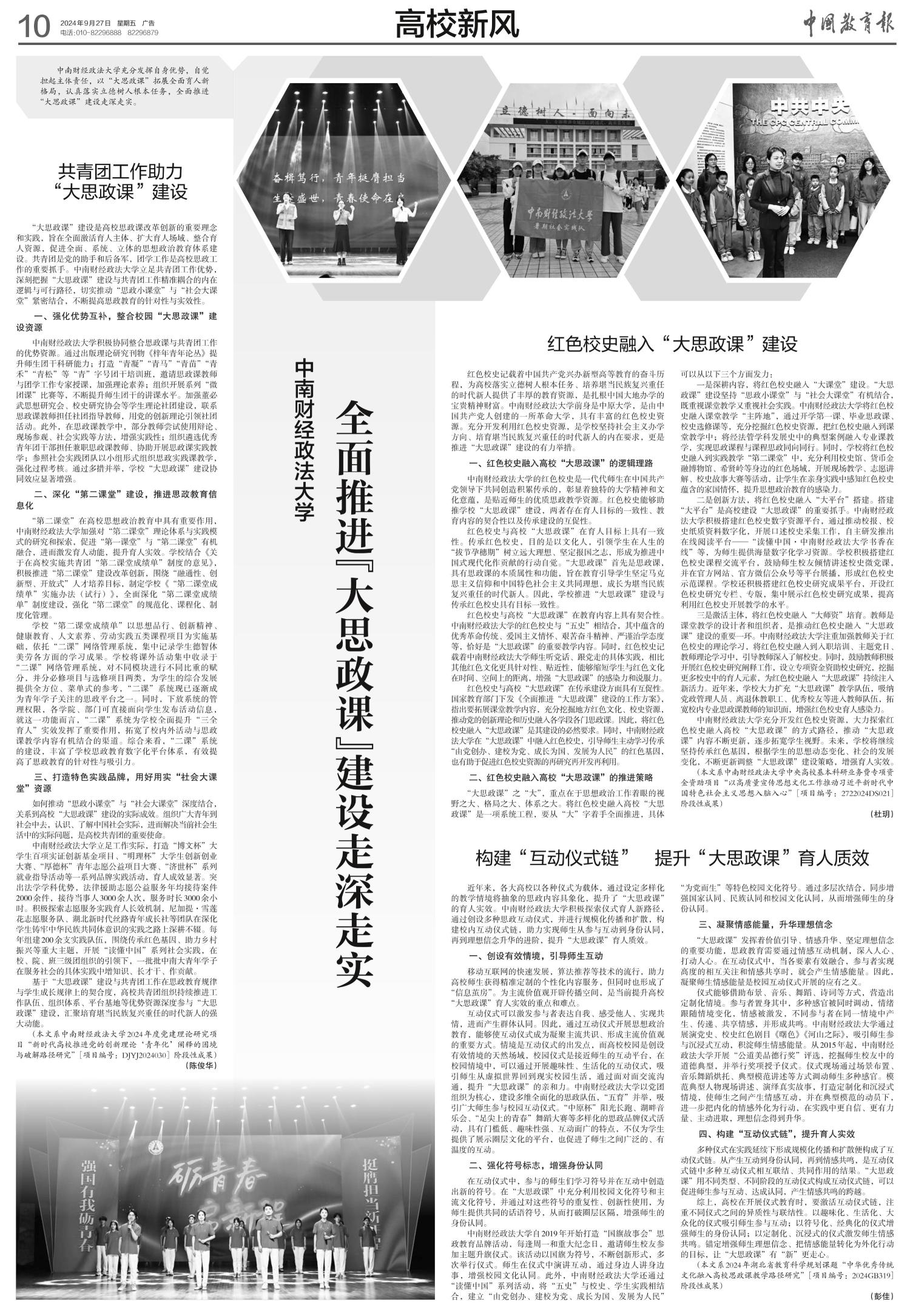 中南财经政法大学充分发挥自身优势,自觉担起主体责任,以“大思政课”拓展全面育人新格局,认真落实立德树人根本任务,全面推进“大思政课”建设走深走实。