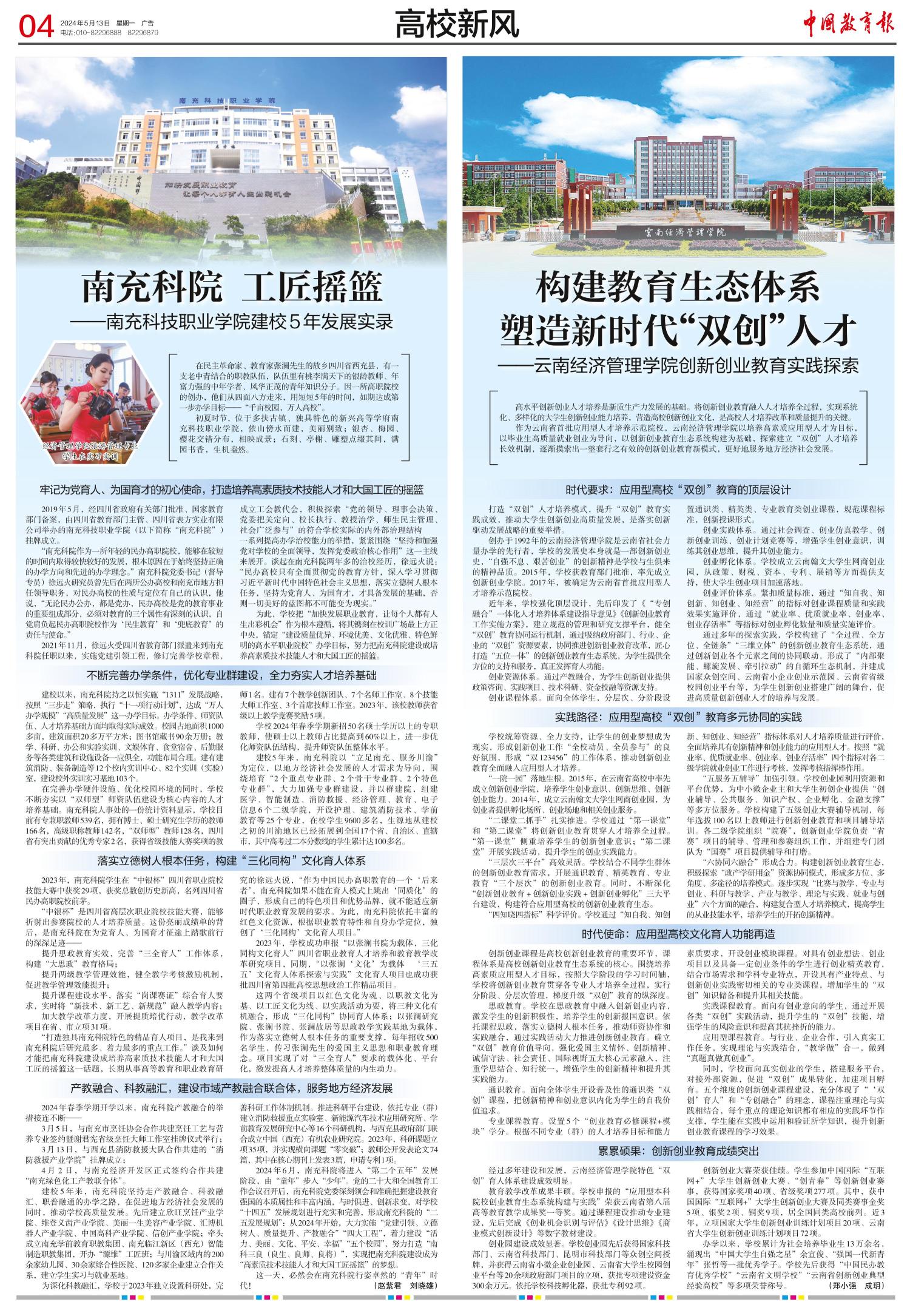 通过多年的探索实践,学校构建了“全过程、全方位、全链条”“三维立体”的创新创业教育生态系统,通过创新创业各个元素之间的协同联动,形成了“内部聚能、螺旋发展、牵引拉动”的自循环生态机制,并建成国家众创空间、云南省小企业创业示范园、云南省省级校园创业平台等,为学生创新创业搭建广阔的舞台,促进高质量创新创业人才的培养与发展。